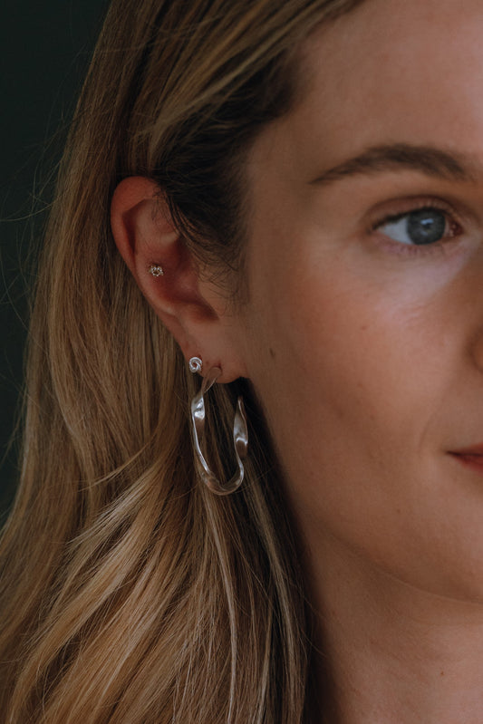 Shop from silver earrings handcrafted from 100% recycled sterling silver and recycled 18k gold vermeil plated. From on-trend and best selling hoop earrings, mini huggies that can be stacked in multiple ear piercings, to elegant dangle earrings for a statement earring look, timeless stud earrings and on trend ear cuffs – that require no piercings.