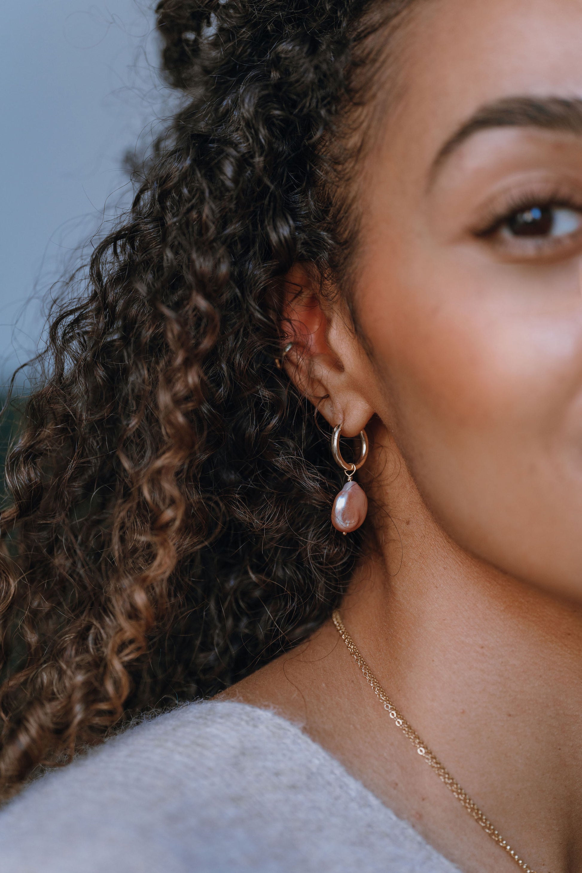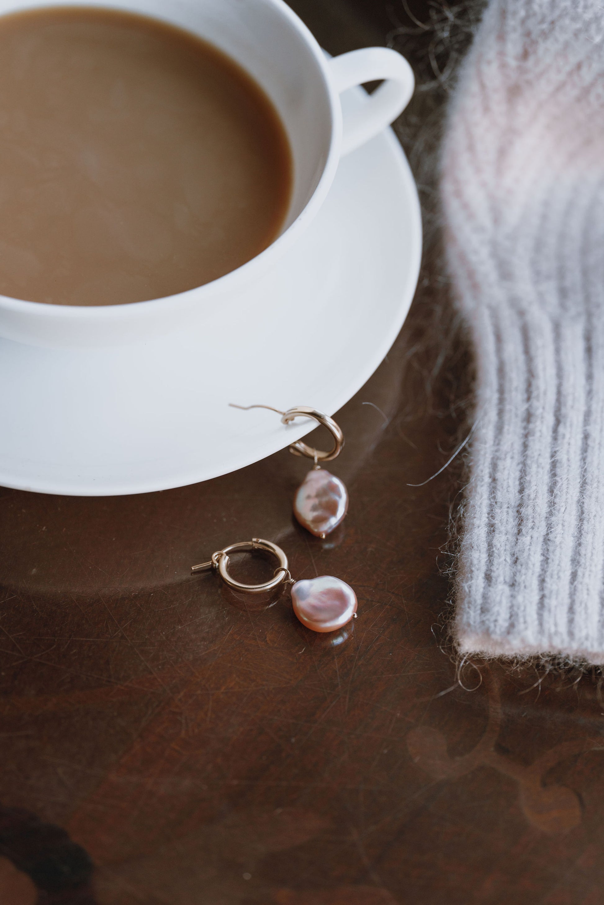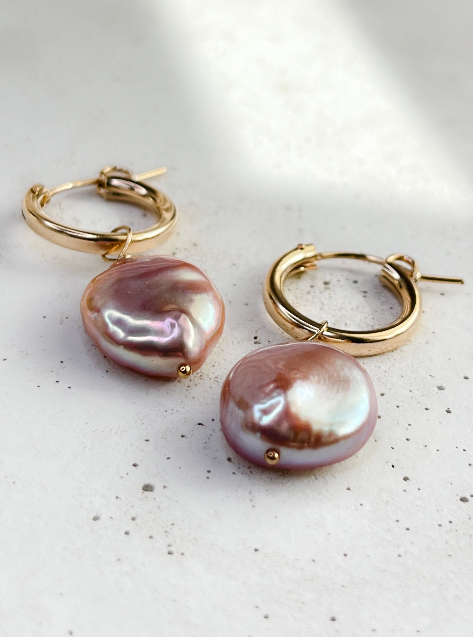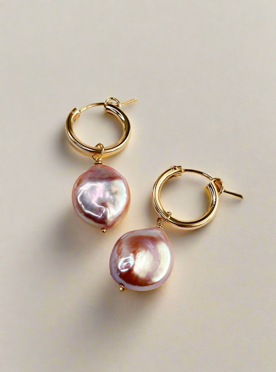 Beautiful hoop earrings using lavender/mauve coloured freshwater coin pearls that have a stunning iridescent sheen. Each pearl is completely unique and very vary slightly in shape and shade.