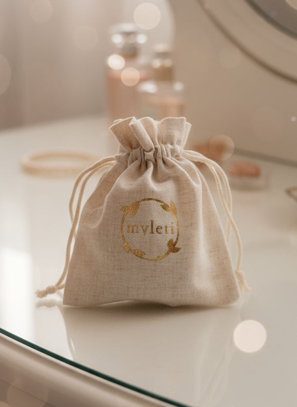 Every Myleti purchase comes carefully wrapped in eco tissue paper and placed inside a pretty organic cotton/linen drawstring pouch, so perfect for storing your jewellery in.
