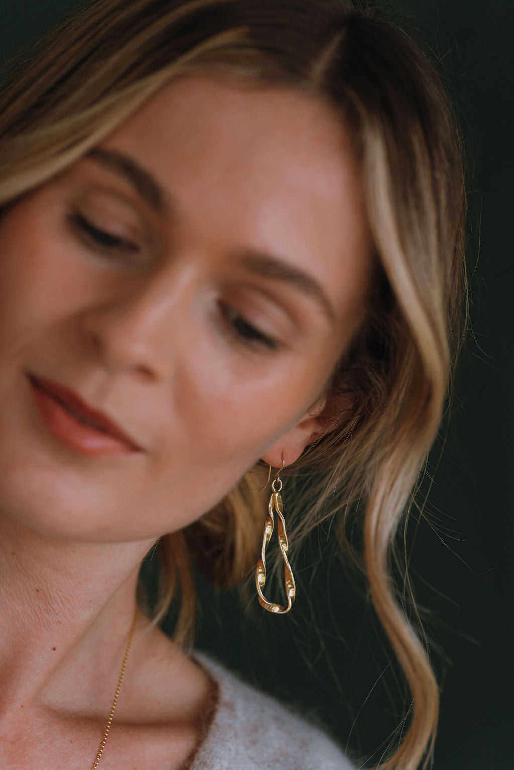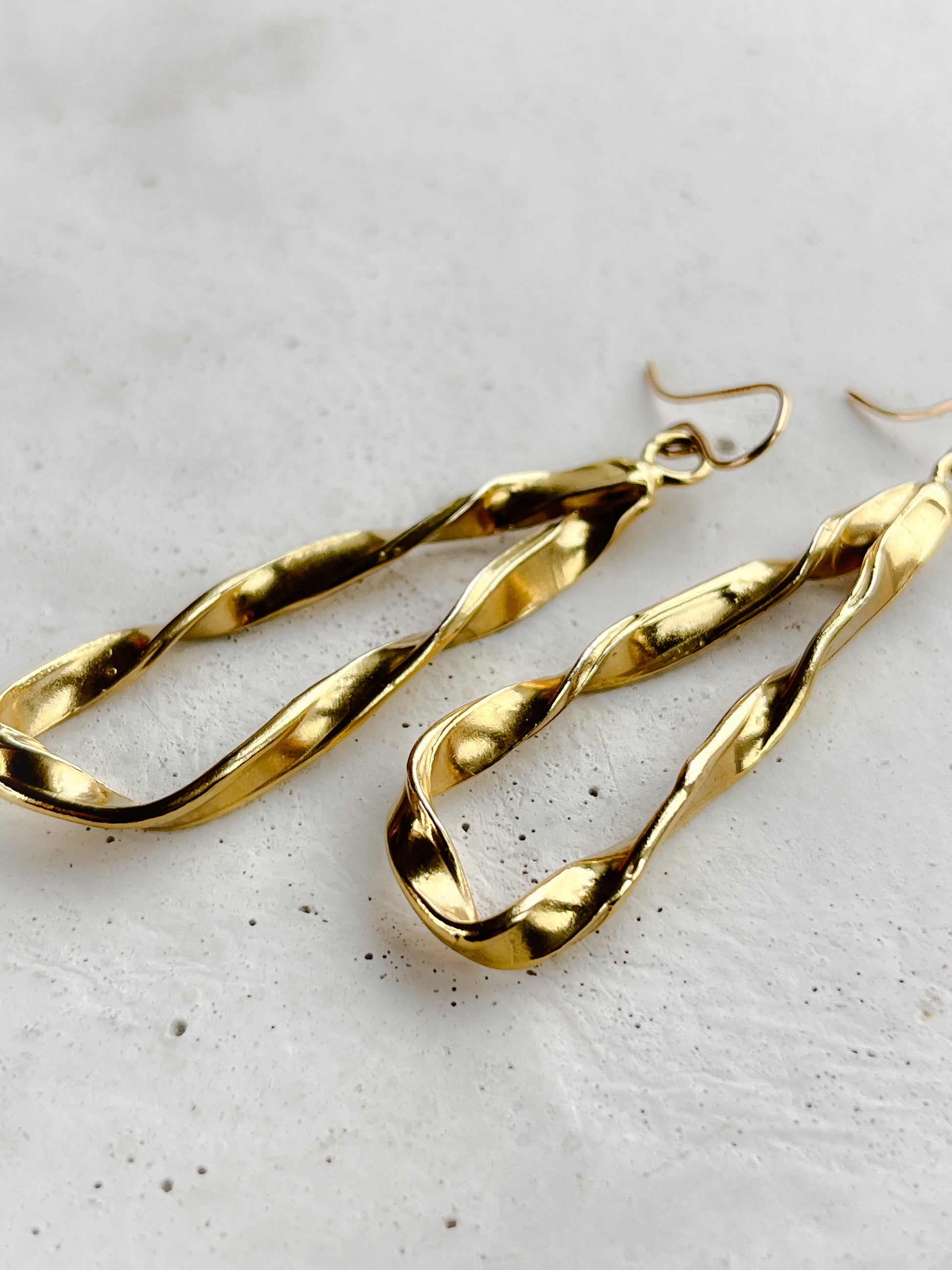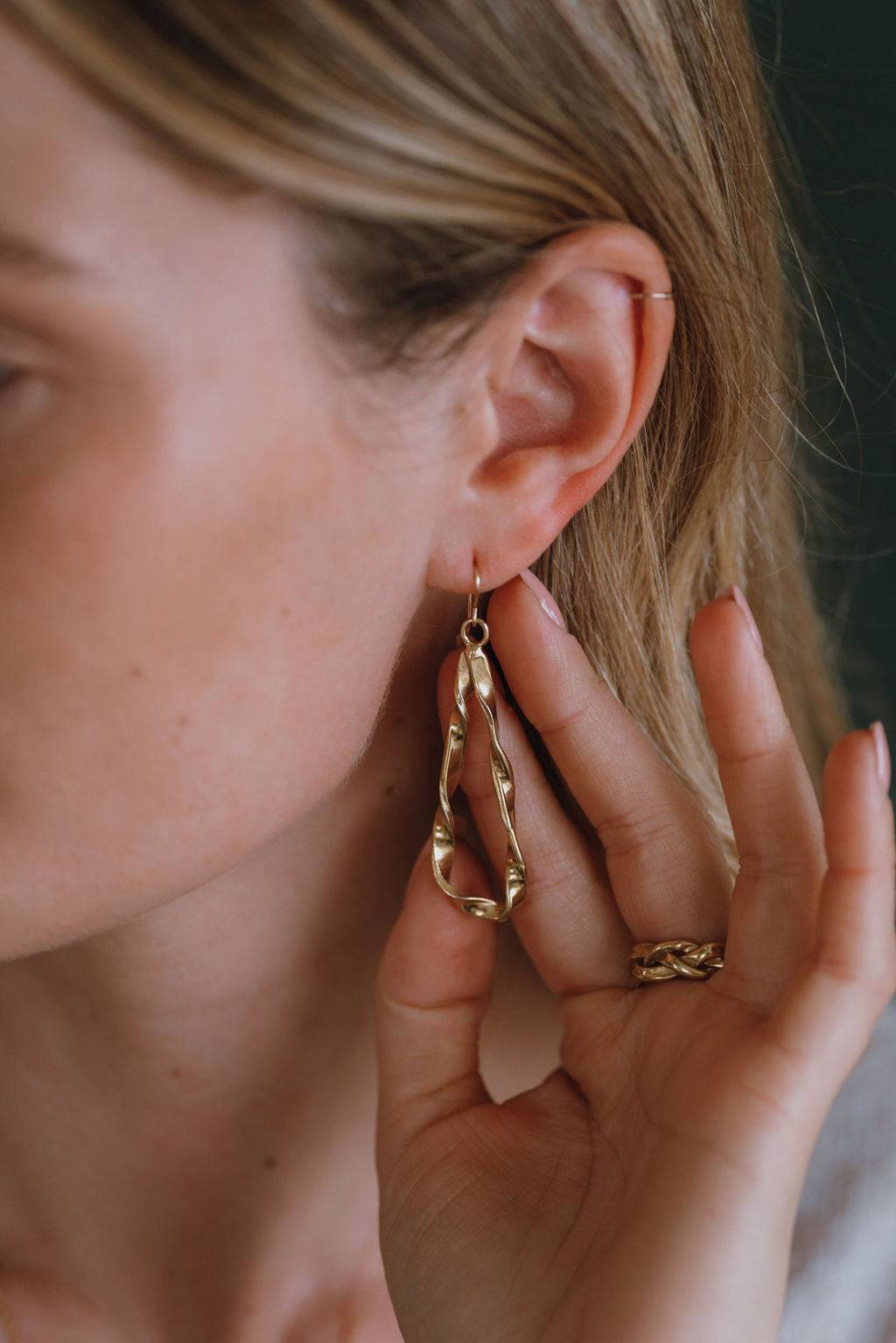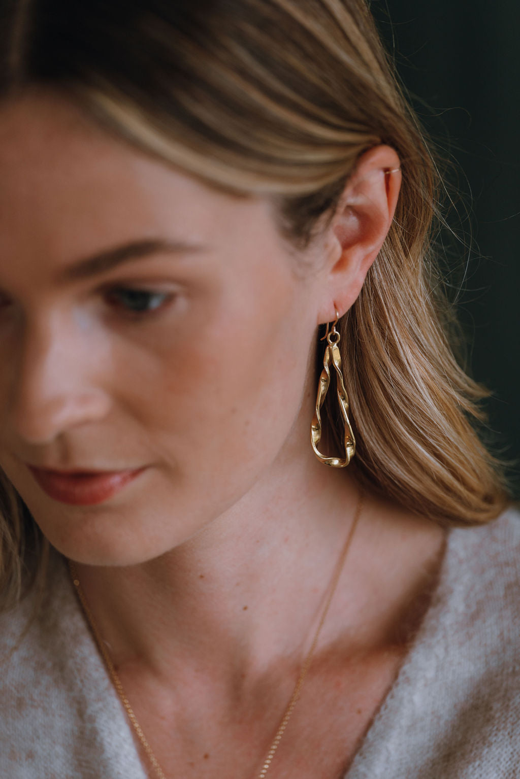 A timeless and unique pair of statement drop earrings that hold a beauty which will be treasured forever. Inspired by movement and organic flowing forms, the gentle twist design catches the light beautifully when worn.