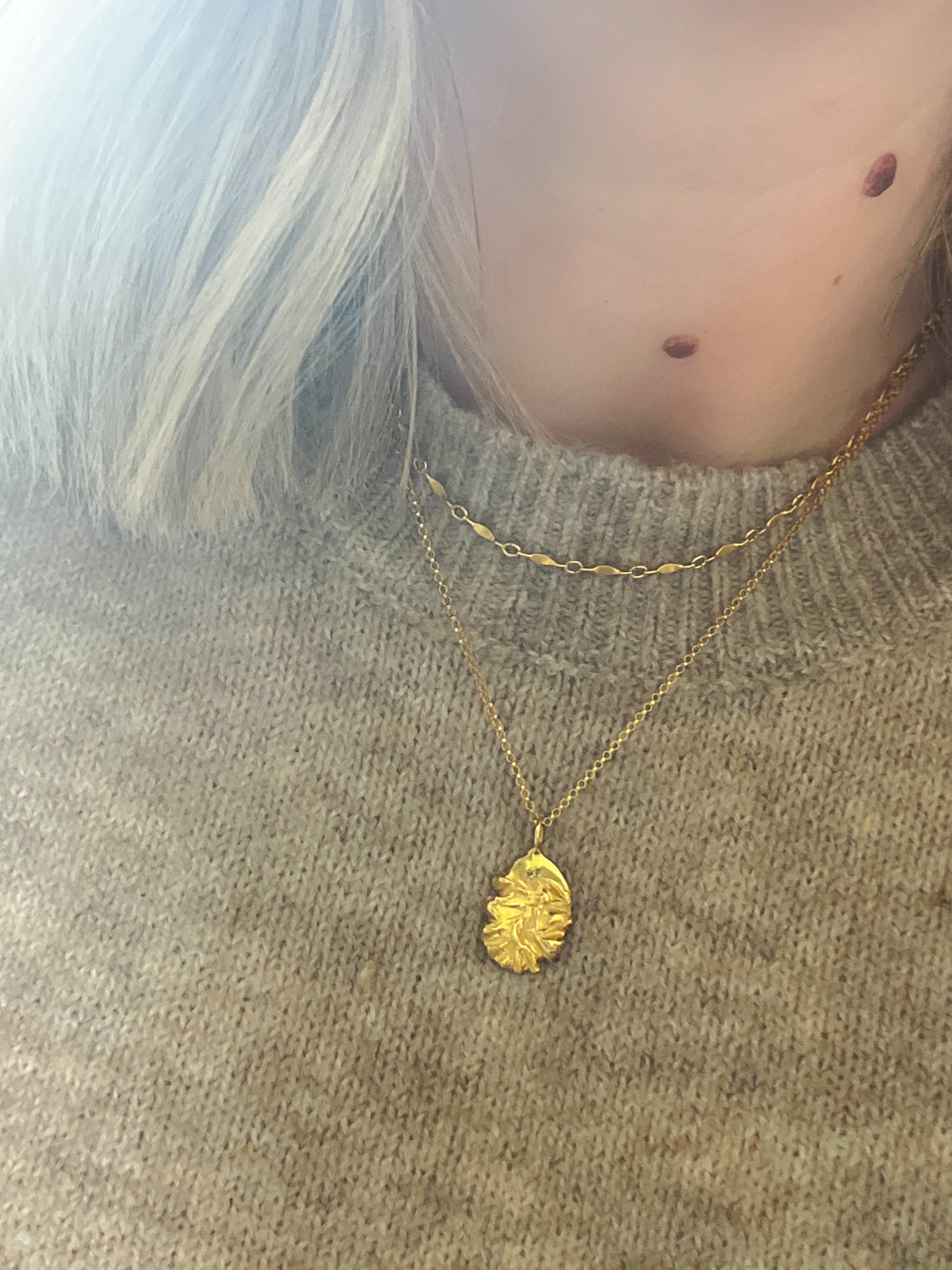 Unique and beautiful necklace, with a textured organic appearance. In a gentle teardrop shape that emulates waves flowing. This necklace is reminiscent of an ancient fossil that has been uncovered in nature.