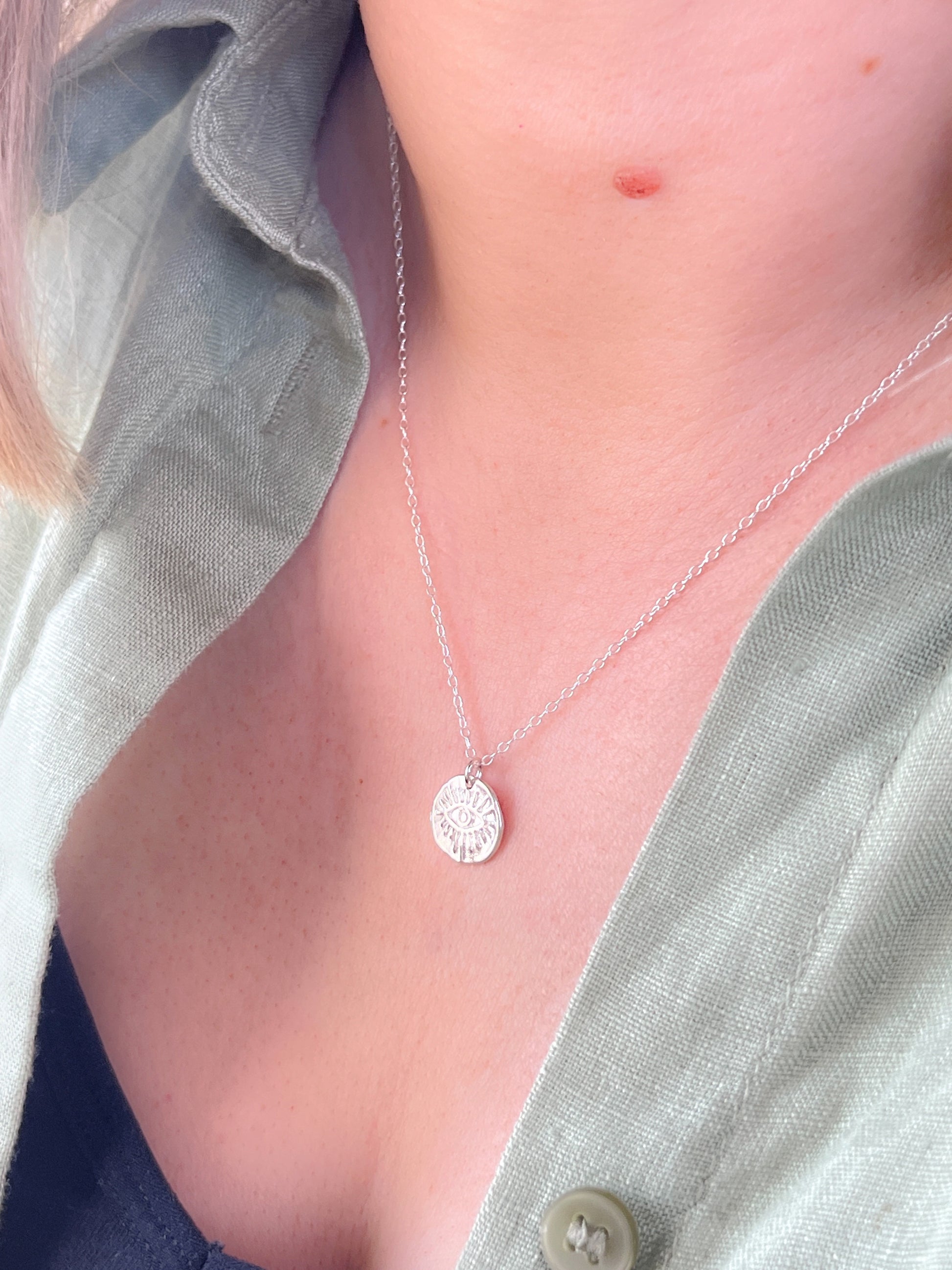 This ancient eye pendant is such a pretty coin necklace to wear around your neck and is a timeless symbol of good luck.