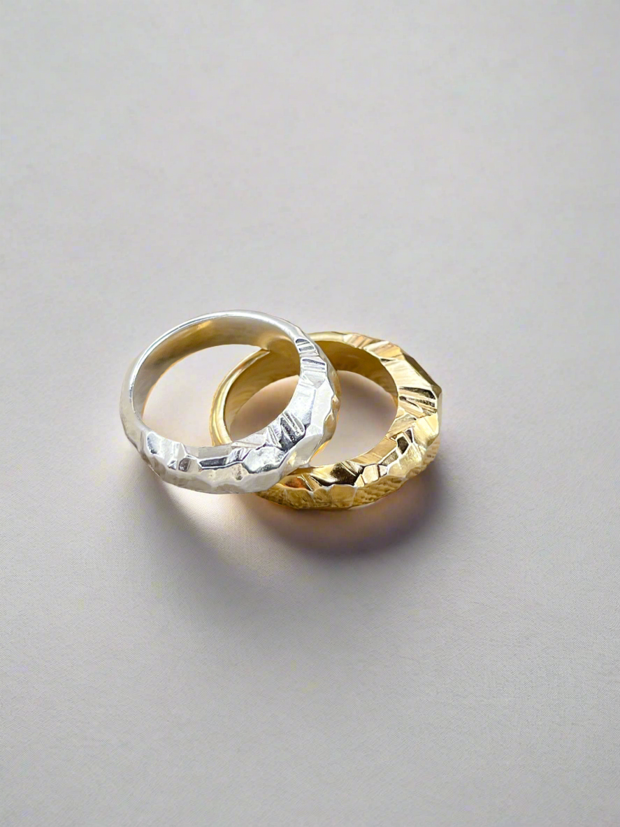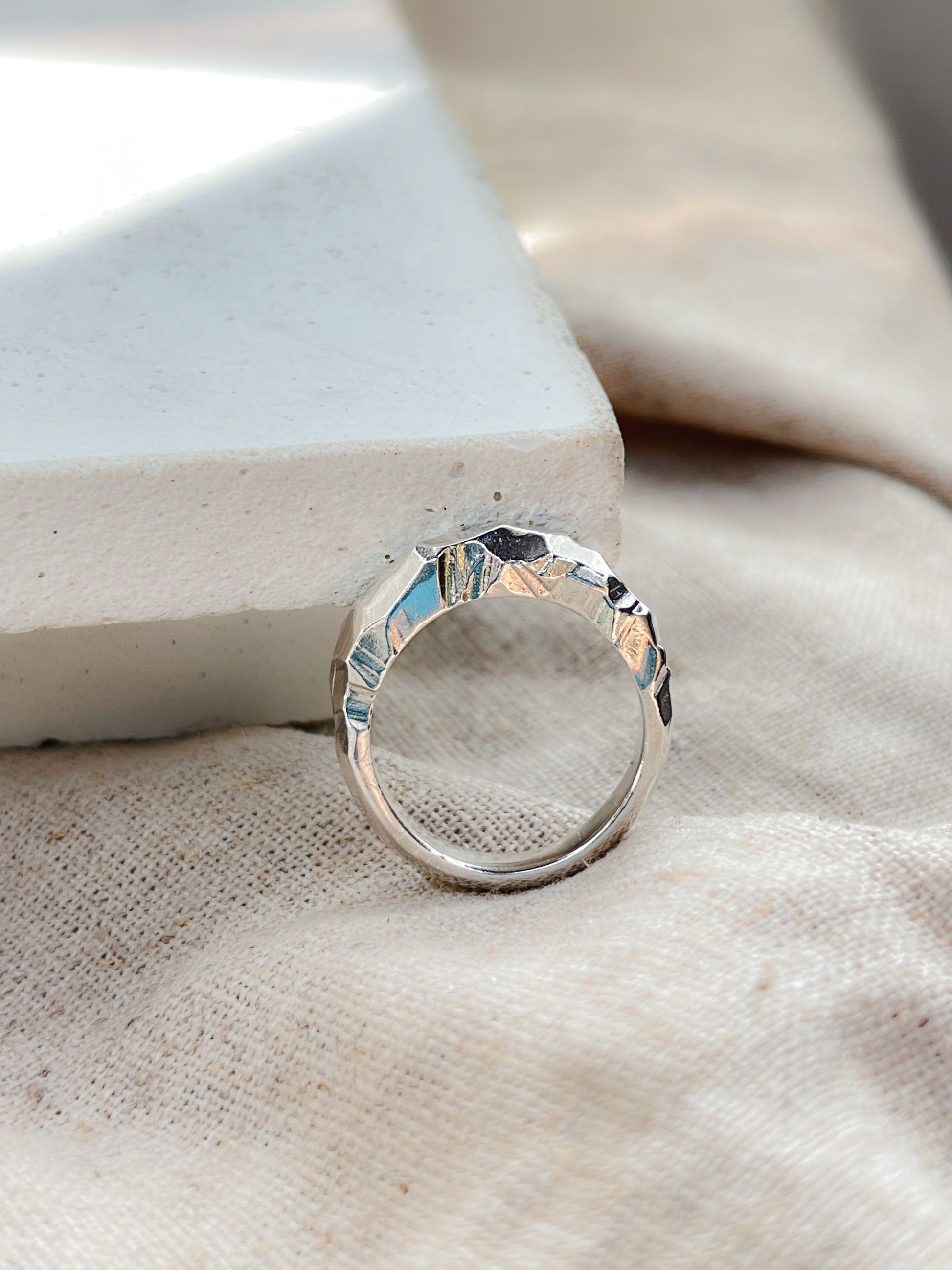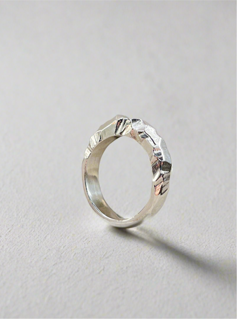 Unique faceted design ring that catches the light beautifully. Intricately carved from jewellers wax and then casted in to solid sterling silver.