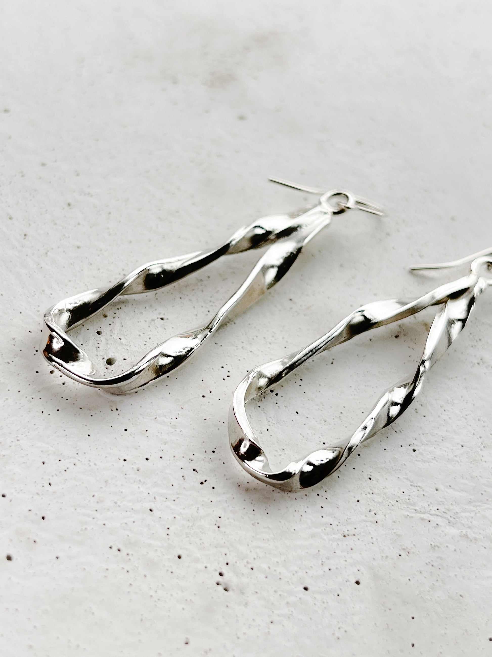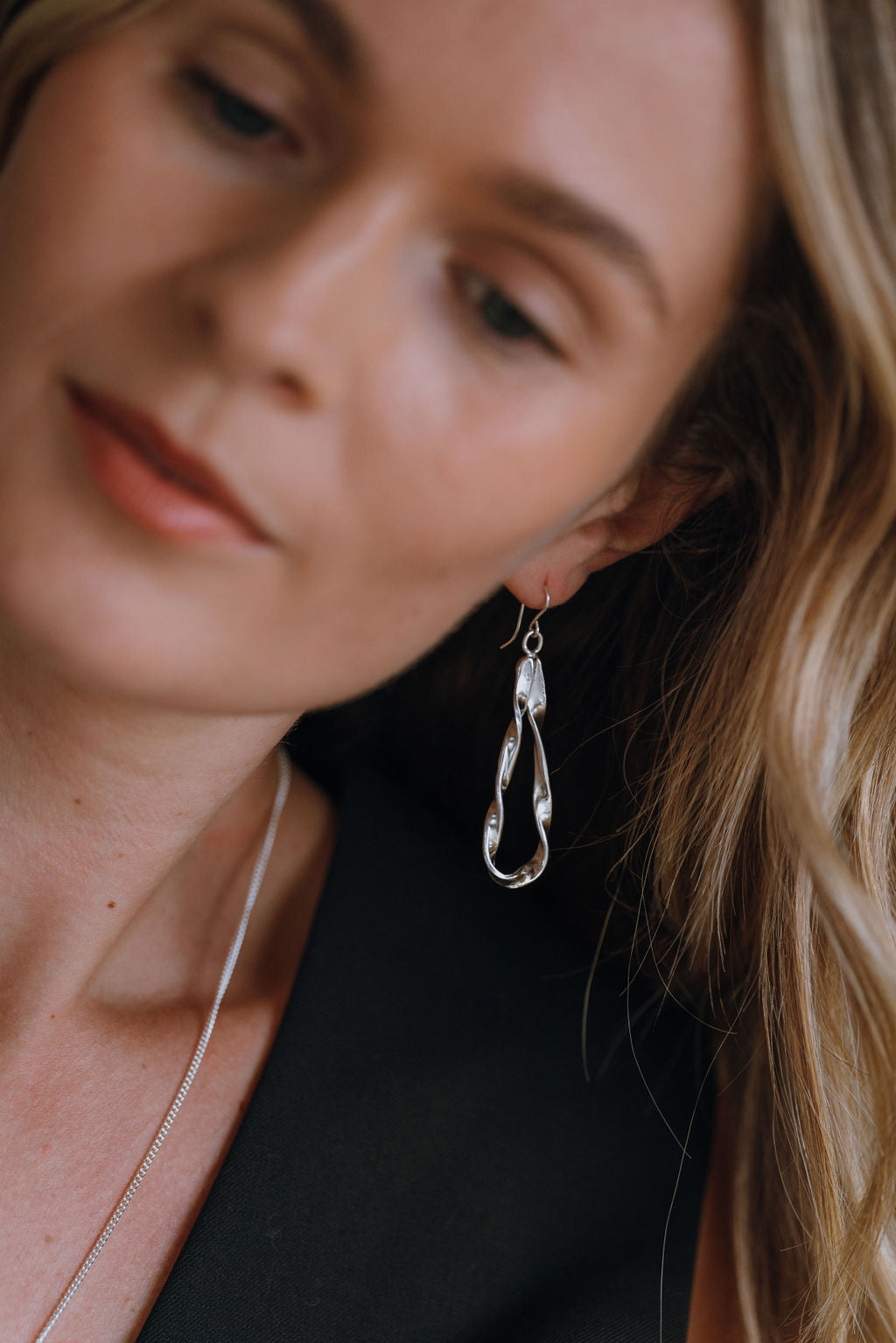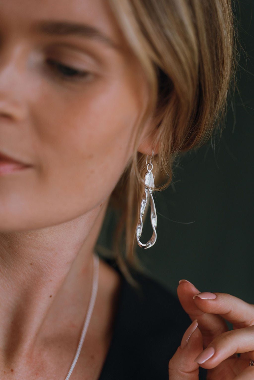 A timeless and unique pair of statement drop earrings that hold a beauty which will be treasured forever. Inspired by movement and organic flowing forms, the gentle twist design catches the light beautifully when worn.