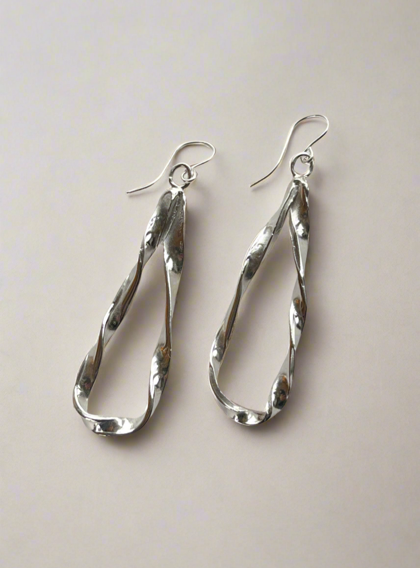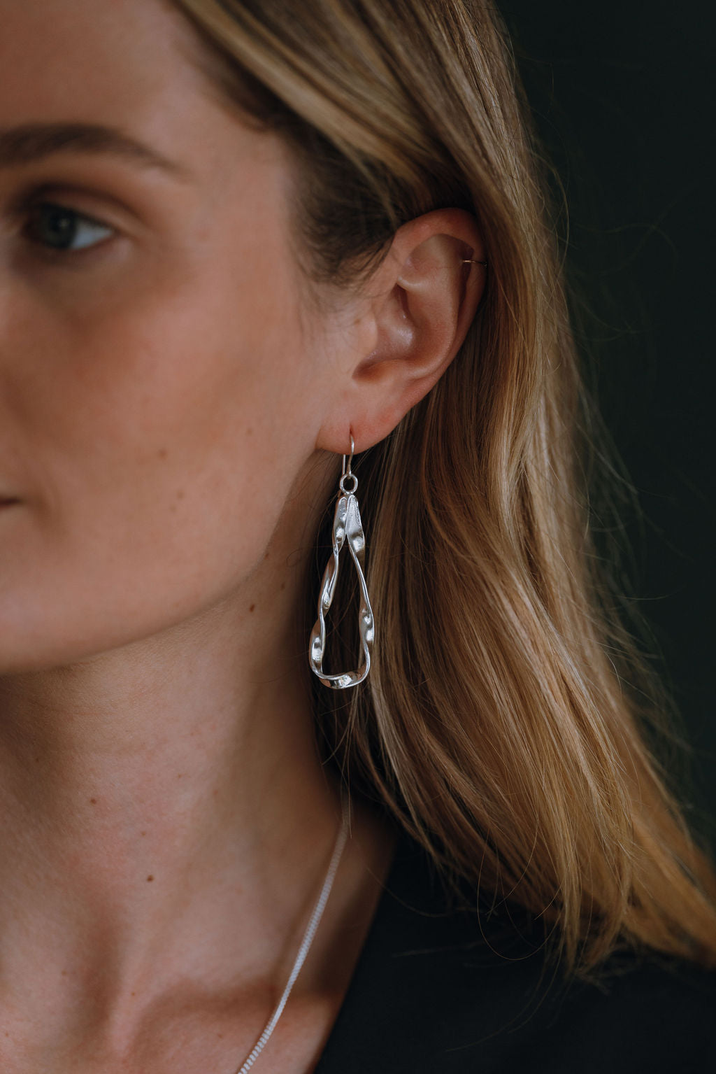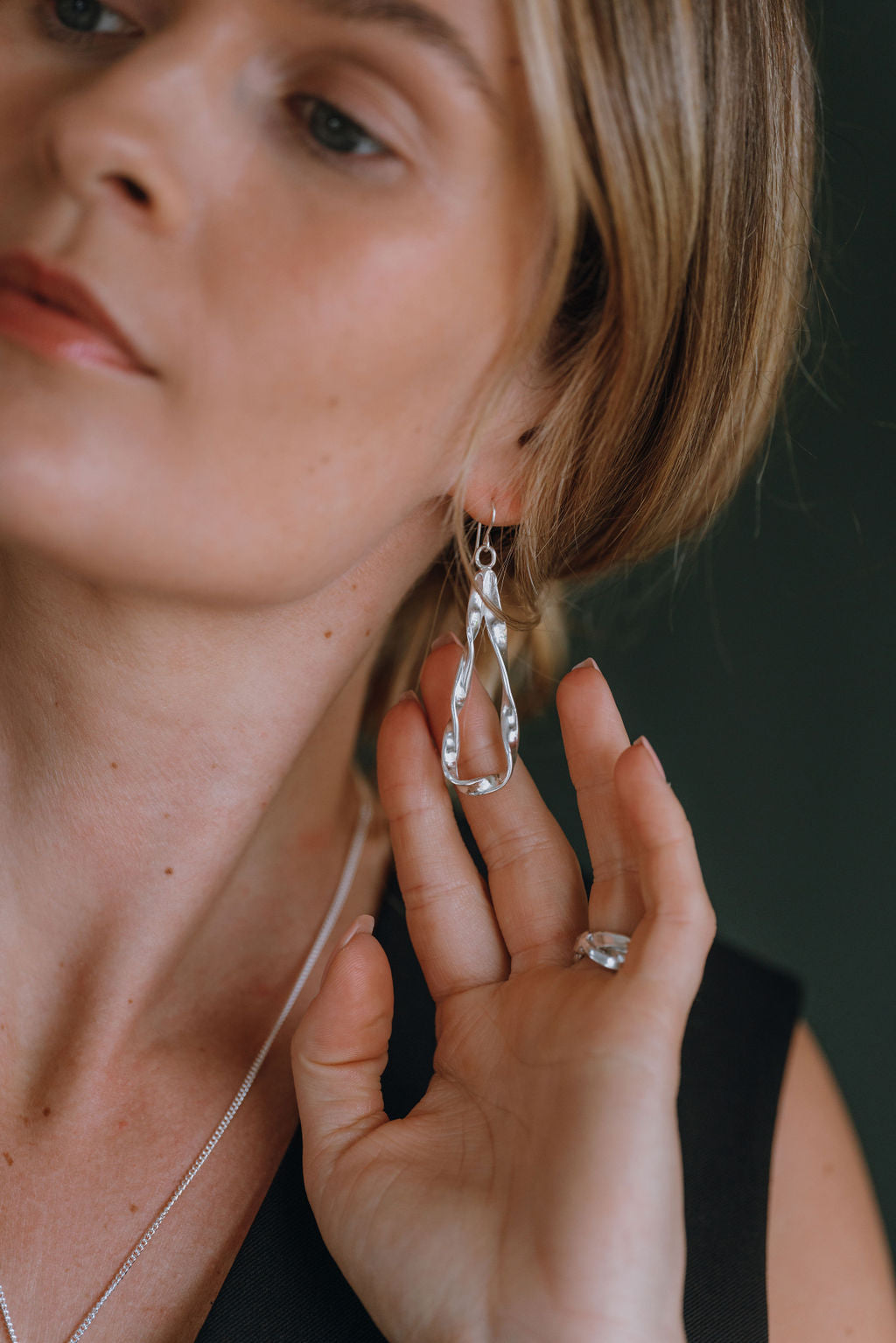 A timeless and unique pair of statement drop earrings that hold a beauty which will be treasured forever. Inspired by movement and organic flowing forms, the gentle twist design catches the light beautifully when worn.